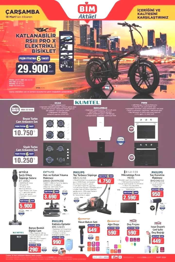 BİM aktüel kataloğu 18-20 Mart 2026 listesinde teknoloji ürünleri, küçük ev aletleri ve mutfak araçları geniş bir yer bulmuştur. Özellikle elektrikli bisikletler ve büyük ekran televizyonlar, haftanın gözdesi oldu.