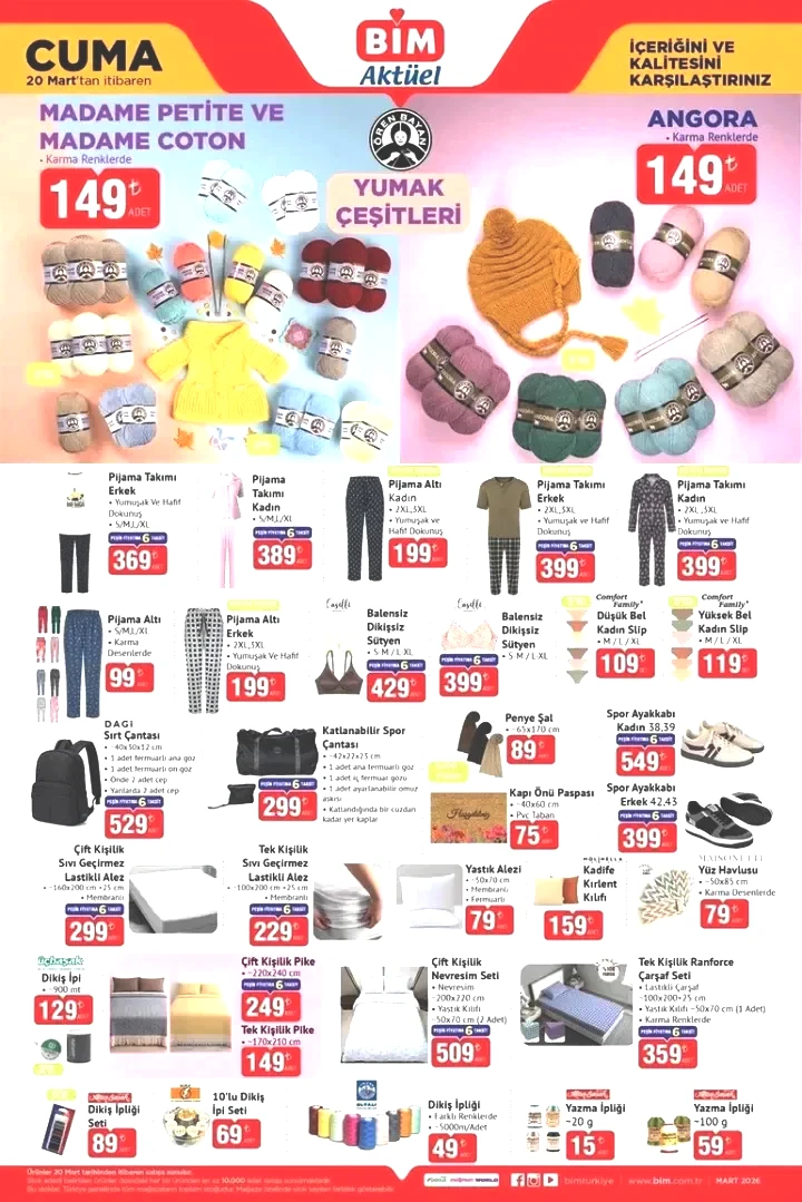 20 Mart 2026 Cuma günü, giyim ve ev tekstili ürünlerine raflarda yer verilecek. Ramazan ayına denk gelen bu kataloğunda, pijama takımları ve günlük kullanıma uygun ürünler dikkat çekiyor.
